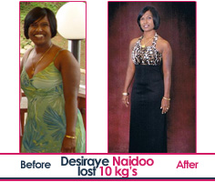 Desiraye Naidoo and I am 33 years old Well what do you know the Best Weight loss programme lives up to its Name . After all the torture I put myself through for 3 months it is so worth it. All my life I have been health conscious and always ate healthily and exercised regularly. My daughter is now 5 years old and I have been married for 6 years already. Both my husband and daughter love good food and I love to cook for them. My weight has always been constant for the past 10 years until last year when I had put on an additional 5 kg's and became absolutely uncomfortable with that extra weight. I had to do something about it. I had always dressed appropriately so no one even noticed I had 5 kg's extra on me. But I just couldn't let go of that uncomfortable feeling.